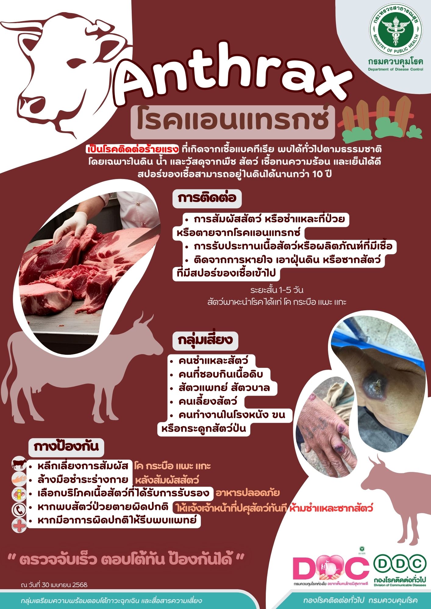 วันนี้ (1 พฤษภาคม 2568) นายแพทย์ภาณุมาศ ญาณเวทย์สกุล อธิบดีกรมควบคุมโรค กล่าวถึง กรณีพบผู้เสียชีวิตด้วยโรคแอนแทรกซ์ (Anthrax) 1 ราย ในจังหวัดมุกดาหาร ว่า ผู้ป่วยเป็นเพศชาย อายุ 53 ปี โรคประจำตัวเป็นโรคเบาหวาน อาชีพรับจ้างก่อสร้าง เริ่มมีตุ่มแผลขึ้นบริเวณมือข้างขวาเมื่อวันที่ 24 เมษายน 2568 และเข้ารับการรักษาที่โรงพยาบาลวันที่ 27 เมษายน 2568 ด้วยอาการแผลที่มือเริ่มมีสีดำชัดเจนขึ้น ต่อมน้ำเหลืองใต้รักแร้ข้างขวาโต และมีอาการหน้ามืด ชักเกร็ง ก่อนเสียชีวิตในเวลาต่อมา ขณะเข้ารับการรักษา แพทย์สงสัยโรคแอนแทรกซ์ จึงเก็บตัวอย่างส่งตรวจทางห้องปฏิบัติการที่กรมวิทยาศาสตร์การแพทย์ และสถาบันบำราศนราดูร ผลพบเชื้อ Bacillus anthracis จากการสอบสวนโรคเบื้องต้นคาดว่า ปัจจัยเสี่ยงมาจากการชําแหละโคในงานบุญผ้าป่าและมีการนำเนื้อโคที่ชําแหละไปแจกจ่ายให้รับประทานกันภายในหมู่บ้าน ขณะนี้ทีมปฏิบัติการสอบสวนควบคุมโรค กรมควบคุมโรค ร่วมกับทีมสำนักงานป้องกันควบคุมโรคที่ 10 จ.อุบลราชธานี สำนักงานสาธารณสุขจังหวัด และทีมปศุสัตว์ได้ลงพื้นที่สอบสวนโรคเบื้องต้นพบผู้สัมผัสจำนวน 247 คน แบ่งเป็นผู้ที่ชำแหละโค 28 คน และผู้ที่บริโภคเนื้อโคดิบ 219 คน ได้ให้ยาในกลุ่มผู้สัมผัสเสี่ยงสูง อยู่ระหว่างดำเนินมาตรการป้องกันการควบคุมโรคในพื้นที่
